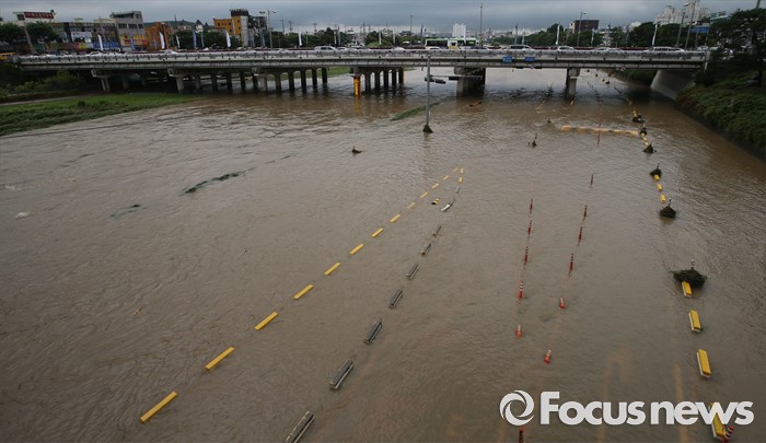 (청주=포커스뉴스) 충청 및 중부지역에 호우경보가 발생한 4일 오후 충북 청주시 무심천 하상도로가 내린비로 잠겨 있다.