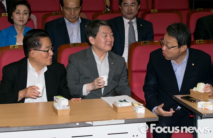(서울=포커스뉴스) 5일 오전 서울 여의도 국회 의원회관에서 열린 국민의당 성희롱 예방교육에 참석한 안철수(가운데) 전 대표와 박지원(왼쪽) 비대위원장, 김성식 정책위의장이 대화하고 있다.