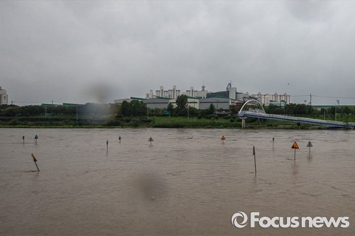 (서울=포커스뉴스) 최고 300mm 물폭탄이 내릴 것으로 예고되어 전국적으로 호우주의보와 경보가 내린 5일 오전 서울 중랑구 중랑천 월릉교 인근 둔치의 시민공원이 물에 잠겨 있다.