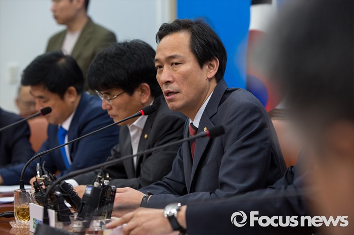 (서울=포커스뉴스) 우상호 더불어민주당 원내대표가 5일 오전 서울 여의도 국회에서 열린 원내대책회의에 참석해 모두발언 하고 있다.