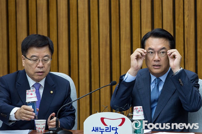 (서울=포커스뉴스) 정진석(오른쪽) 새누리당 원내대표와 김광림 정책위의장이 5일 오전 서울 여의도 국회에서 열린 원내대책회의에 참석해 회의 시작을 기다리고 있다.
