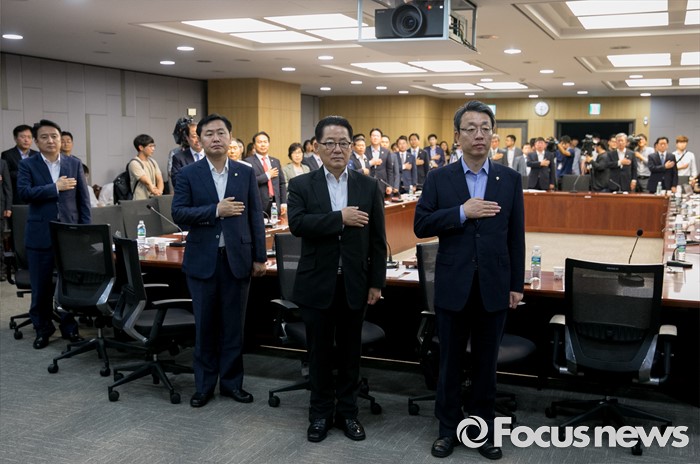 (서울=포커스뉴스) 5일 오전 서울 여의도 국회 의원회관에서 열린 국민의당 의원총회에 참석한 박지원 비대위원장과 김성식 정책위의장 등 의원들이 국기에 대한 경례를 하고 있다.