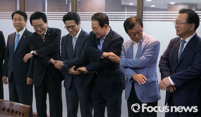 (서울=포커스뉴스) 5일 오전 서울 여의도 국회 의원회관 의원식당에서 열린 남북관계 정상화를 위한 여야 중진 의원 1차 모임에 참석한 의원들이 취재진을 향해 포즈를 취하고 있다. 왼쪽부터 조정식, 변재일 더불어민주당 의원, 정병국 새누리당 의원, 박주선 국민의당 의원, 원혜영, 김부겸 더불어민주당 의원.