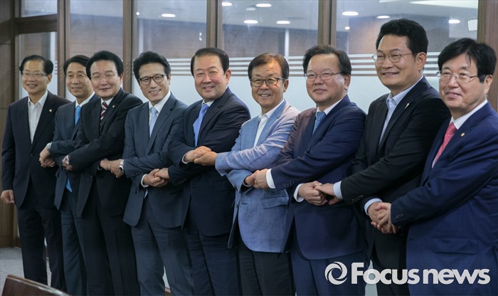 (서울=포커스뉴스) 5일 오전 서울 여의도 국회 의원회관 의원식당에서 열린 남북관계 정상화를 위한 여야 중진 의원 1차 모임에 참석한 의원들이 취재진을 향해 포즈를 취하고 있다. 왼쪽부터 오제세, 조정식, 변재일 더불어민주당 의원, 정병국 새누리당 의원, 박주선 국민의당 의원, 원혜영, 김부겸, 송영길 더불어민주당 의원, 강길부 새누리당 의원.