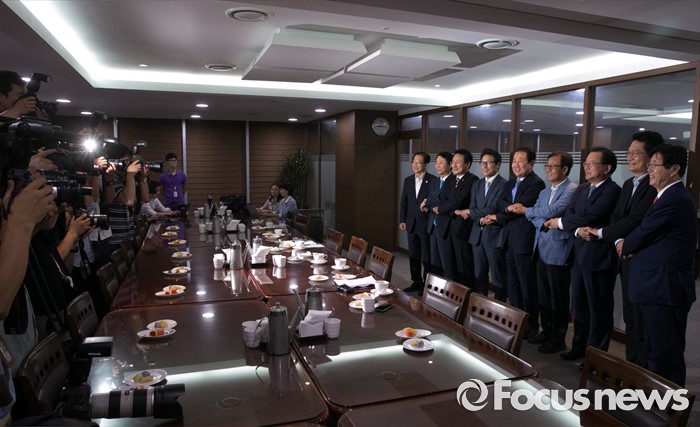 (서울=포커스뉴스) 5일 오전 서울 여의도 국회 의원회관 의원식당에서 열린 남북관계 정상화를 위한 여야 중진 의원 1차 모임에 참석한 의원들이 취재진을 향해 포즈를 취하고 있다.