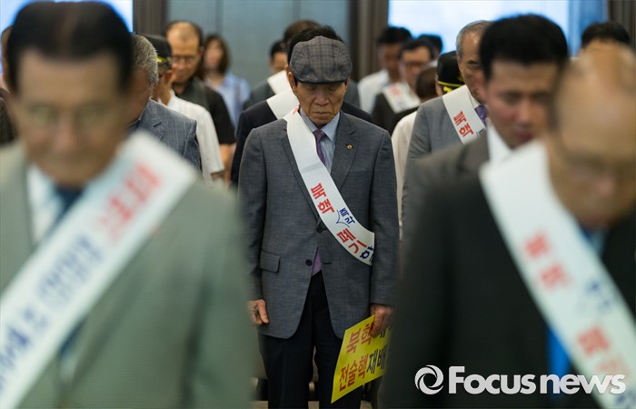 (서울=포커스뉴스) 북핵폐기천만인서명운동본부 등 시민단체 관계자들이 5일 오전 서울 중구 프레스센터에서 열린 북핵폐기 천만인서명, 250만명 돌파 기자회견에 참석해 묵념하고 있다.