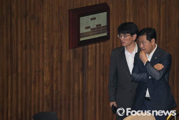 (서울=포커스뉴스) 5일 오전 서울 여의도 국회에서 343회 국회(임시회) 7차 본회의, 정치·외교·통일·안보·교육·사회·문화에 관한 질문이 정회된 후 박완주(왼쪽) 더불어민주당 원내수석부대표, 김관영 국민의당 원내수석부대표가 심각한 표정으로 논의하고 있다.