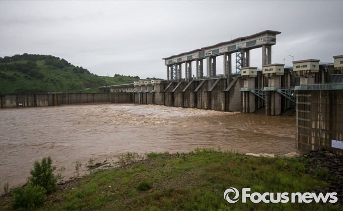 (연천=포커스뉴스) 태풍 네파탁이 북상하고 전국 곳곳에 호우주의보와 경보가 내린 5일 오전 경기도 연천군 군남홍수조절지에서 한국수자원공사가 수위조절을 위해 임진강 강물을 방류하고 있다.