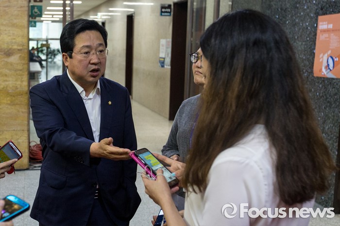(서울=포커스뉴스) 이장우 새누리당 의원이 5일 오전 서울 여의도 국회에서 열린 '343회 국회(임시회) 7차 본회의 정치, 외교, 통일, 안보, 교육, 사회, 문화에 관한 질문에 참석한 김동철 국민의당 의원과 언쟁을 벌인 뒤 취재진 질문에 답하고 있다.