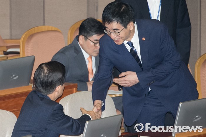 (서울=포커스뉴스) 5일 오전 서울 여의도 국회에서 열린 343회 국회(임시회) 7차 본회의, 정치·외교·통일·안보·교육·사회·문화에 관한 질문에 참석한 이준식(오른쪽) 사회부총리 겸 교육부 장관과 한민구 국방부 장관이 인사하고 있다.