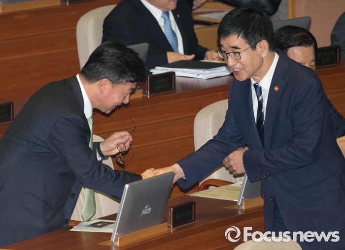 (서울=포커스뉴스) 5일 오전 서울 여의도 국회에서 열린 343회 국회(임시회) 7차 본회의, 정치·외교·통일·안보·교육·사회·문화에 관한 질문에 참석한 이준식(오른쪽) 사회부총리 겸 교육부 장관과 홍용표 통일부 장관이 인사하고 있다.