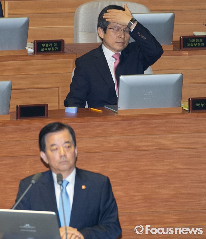 (서울=포커스뉴스) 5일 오전 서울 여의도 국회에서 열린 343회 국회(임시회) 7차 본회의, 정치·외교·통일·안보·교육·사회·문화에 관한 질문에 참석한 황교안 국무총리가 머리를 만지고 있다. 아래는 한민구 국방부 장관.