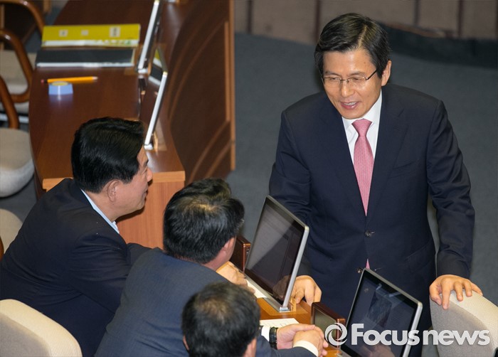 (서울=포커스뉴스) 5일 오후 서울 여의도 국회에서 열린 343회 국회(임시회) 7차 본회의, 정치·외교·통일·안보·교육·사회·문화에 관한 질문에 참석한 황교안 국무총리가 회의 속개를 기다리며 국민의당 의원들과 인사하고 있다. 이날 대정부 질문은 이장우 새누리당 의원 등과 김동철 국민의당 의원의 언쟁으로 오전 회의가 정회됐었다.