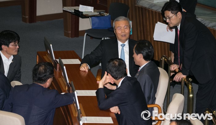 (서울=포커스뉴스) 5일 오후 서울 여의도 국회에서 열린 343회 국회(임시회) 7차 본회의, 정치·외교·통일·안보·교육·사회·문화에 관한 질문에 참석한 김종인 더불어민주당 비대위 대표, 우상호 원내대표, 홍익표 의원 등이 대화하고 있다.
