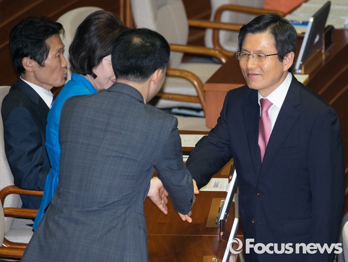 (서울=포커스뉴스) 5일 오후 서울 여의도 국회에서 열린 343회 국회(임시회) 7차 본회의, 정치·외교·통일·안보·교육·사회·문화에 관한 질문에 참석한 황교안 국무총리가 회의 속개를 기다리며 국민의당 의원들과 인사하고 있다. 이날 대정부 질문은 이장우 새누리당 의원 등과 김동철 국민의당 의원의 언쟁으로 오전 회의가 정회됐었다.