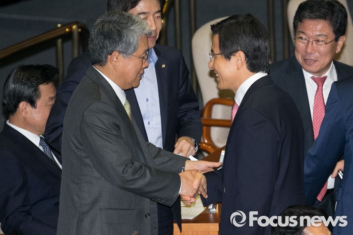 (서울=포커스뉴스) 5일 오후 서울 여의도 국회에서 열린 343회 국회(임시회) 7차 본회의, 정치·외교·통일·안보·교육·사회·문화에 관한 질문에 참석한 황교안 국무총리가 회의 속개를 기다리며 김동철 국민의당 의원과 악수하고 있다. 이날 대정부 질문은 이장우 새누리당 의원 등과 김동철 국민의당 의원의 언쟁으로 오전 회의가 정회됐었다.