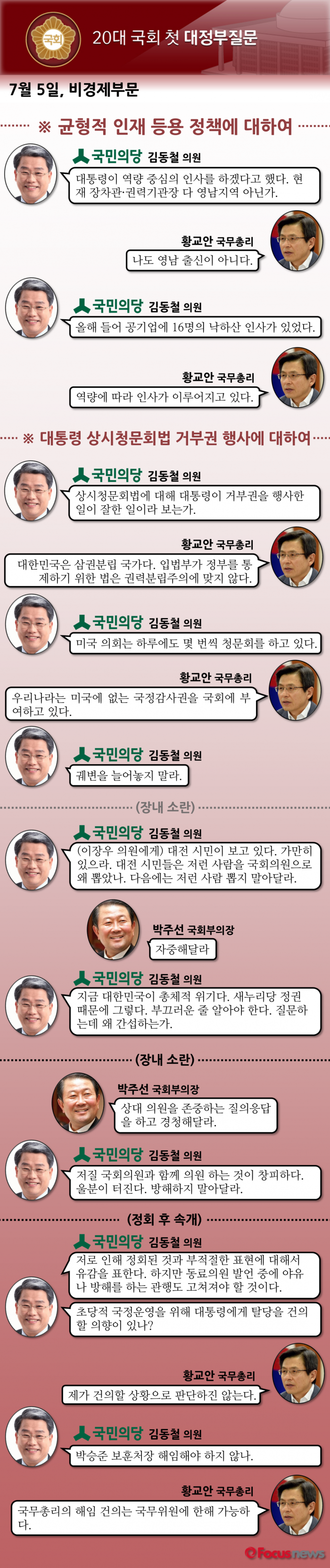 다음은 국민의당 김동철 의원과 황교안 국무총리의 질의응답 내용이다. 김동철 의원이 이장우 새누리당 의원 등을 향해 "저질 국회의원하고 같이 국회의원 하는 것이 창피해죽겠다"는 등의 발언을 쏟아내고 이에 여당 의원들이 크게 반발하면서 국회 대정부질문이 정회되는 초유의 사태가 벌어지기도 했다.