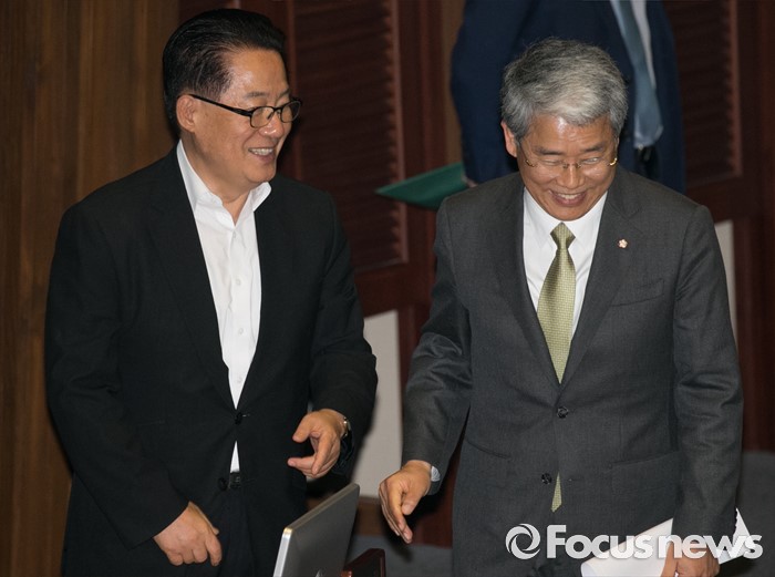 (서울=포커스뉴스) 5일 오후 서울 여의도 국회에서 열린 343회 국회(임시회) 7차 본회의, 정치·외교·통일·안보·교육·사회·문화에 관한 질문에 참석한 박지원(왼쪽) 국민의당 비대위원장이 대정부 질문을 마친 김동철 의원과 인사하고 있다.