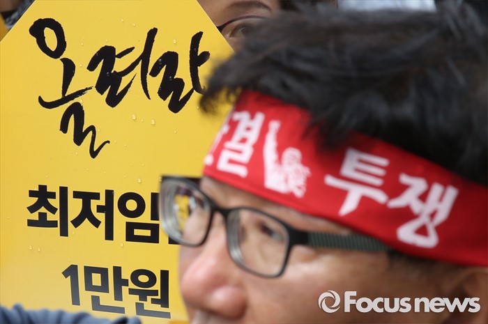 (세종=포커스뉴스) 최저임금위원회 제9차 전원회의가 열린 5일 오후 세종시 정부세종청사 고용노동부 앞에서 한국노총, 민주노총 조합원들이 최저임금 1만원 쟁취 결의대회를 갖고 있다