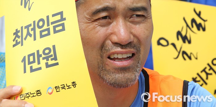 (세종=포커스뉴스) 최저임금위원회 제9차 전원회의가 열린 5일 오후 세종시 정부세종청사 고용노동부 앞에서 한국노총, 민주노총 조합원들이 최저임금 1만원 쟁취 결의대회를 갖고 있다