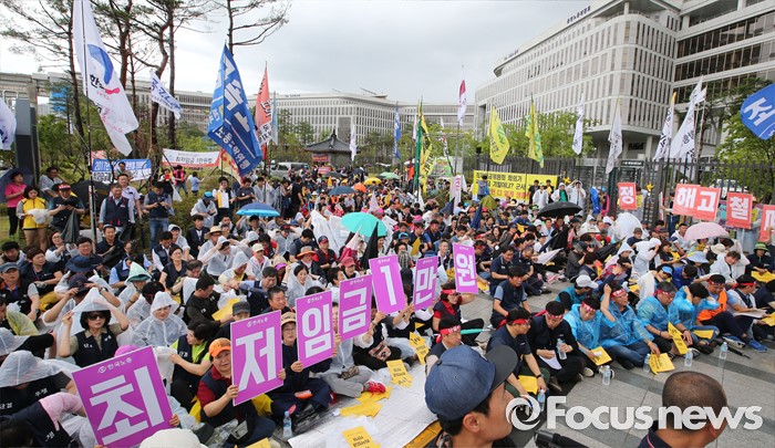 (세종=포커스뉴스) 최저임금위원회 제9차 전원회의가 열린 5일 오후 세종시 정부세종청사 고용노동부 앞에서 한국노총, 민주노총 조합원들이 최저임금 1만원 쟁취 결의대회를 갖고 있다