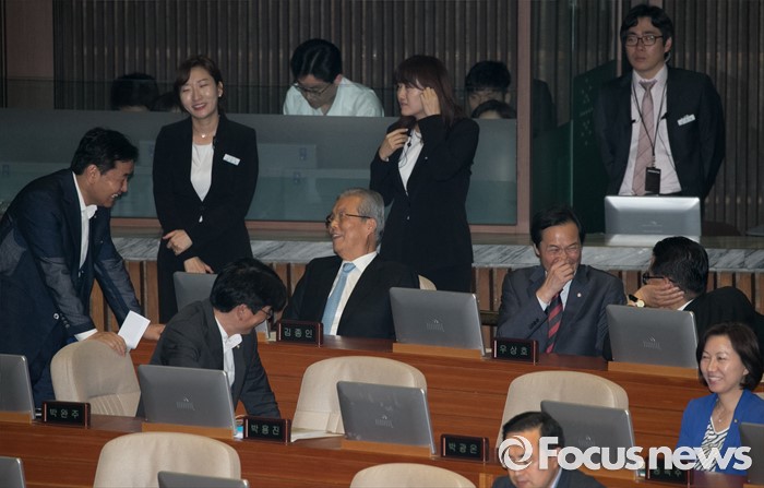 (서울=포커스뉴스) 5일 오후 서울 여의도 국회에서 열린 343회 국회(임시회) 7차 본회의, 정치·외교·통일·안보·교육·사회·문화에 관한 질문에 참석한 김종인 더불어민주당 비대위 대표, 우상호 원내대표와 박지원 국민의당 비대위원장, 김관영 원내수석부대표 등이 대화하고 있다.