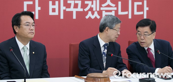(서울=포커스뉴스) 6일 오전 서울 여의도 국회에서 열린 새누리당 혁신비상대책위원회의에 참석한 김희옥(가운데) 위원장과 김광림(오른쪽) 정책위의장이 대화하고 있다. 왼쪽은 정진석 원내대표.