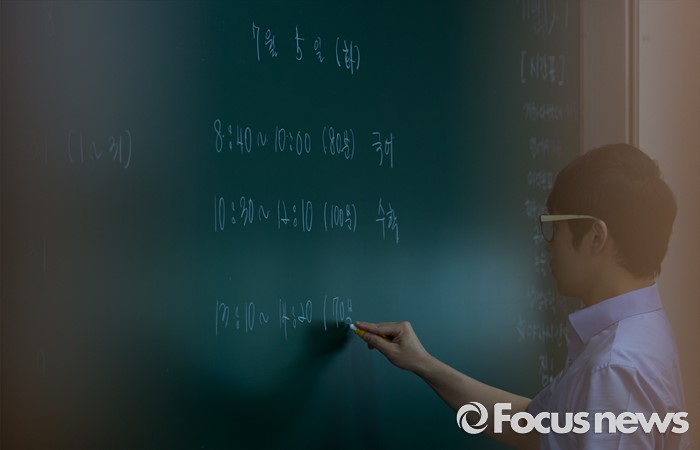 (서울=포커스뉴스) 6일 오전 서울 은평구 신도고등학교에서 한 선생님이 2016학년도 7월 전국연합학력평가 시험 시간을 적고 있다.