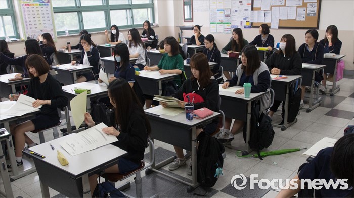 (서울=포커스뉴스) 7월 전국연합학력평가가 실시된 6일 오전 서울 은평구 신도고등학교에서 3학년 학생들이 1교시 국어영역 시험을 치르고 있다.