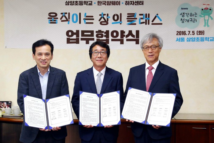박세준 한국암웨이 대표는 "한국암웨이는 창의 인재 육성을 위한 CSR 프로그램을 꾸준히 운영하는 등 미래의 주역이 될 다음 세대들에 대한 투자를 아끼지 않고 있다"며 "이번 삼양초등학교와의 '창의 클래스' MOU가 초석이 돼 앞으로 더욱 많은 교육 기관과 함께 우리의 철학과 노하우를 함께 나눌 수 있었으면 한다"고 말했다.지난 5일 서울 삼양초등학교에서 창의클래스 업무협약식을 기념해 (왼쪽부터) 하자센터 김찬호 부센터장, 삼양초등학교 최현섭 교장, 한국암웨이 박세준 대표가 협약서를 들고 기념촬영을 하고 있다. 2016.07.06 <사진제공=한국암웨이>
