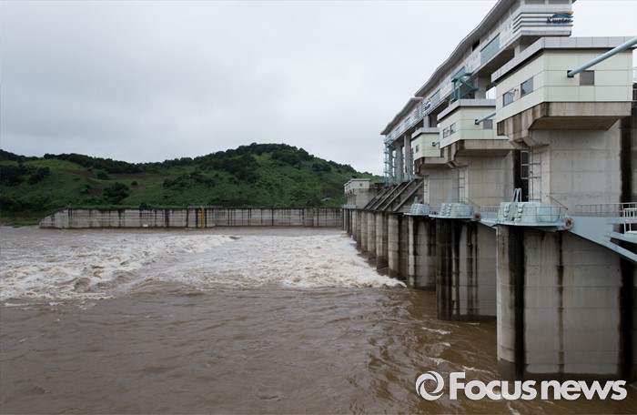 (연천=포커스뉴스) 북한이 황강댐을 방류한 6일 오전 경기도 연천군 군남홍수조절지에서 한국수자원공사가 수위조절을 위해 임진강 강물을 방류하고 있다.