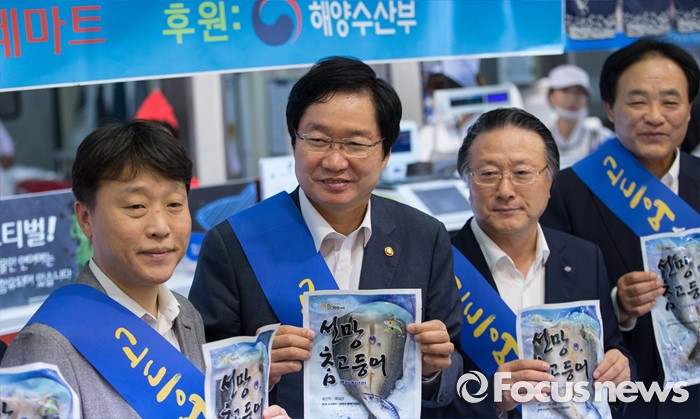 (서울=포커스뉴스) 김영석(왼쪽 두번째) 해양수산부 장관을 비롯한 수협 관계자 들이 6일 오전 서울 용산구 롯데마트 서울역점을 방문해 최근 미세먼지 논란으로 소비가 위축된 고등어 소비 활성화를 위해 판촉 및 시식 행사에 참여하고 있다. 지난 5월 '고등어를 구울 때 미세먼지가 발생한다'는 환경부의 발표이후 소비둔화로 이어져, 고등어를 찾는 사람이 급격히 줄었다.