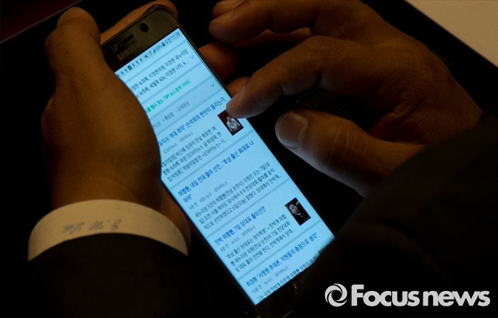 (서울=포커스뉴스) 6일 오전 서울 여의도 국회에서 열린 예산결산특별위원회 전체회의에 참석한 이정현 새누리당 의원이 핸드폰으로 본인 기사를 검색하고 있다.