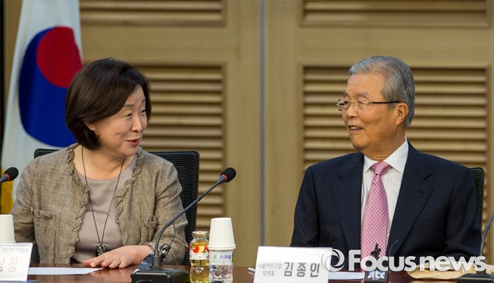 (서울=포커스뉴스) 김종인(오른쪽) 더불어민주당 비상대책위 대표와 심상정 정의당 상임대표가 6일 오전 서울 여의도 국회의원회관에서 열린 '따뜻한 미래를 위한 정치기획 창립기념 특강'에 참석해 대화 하고 있다.