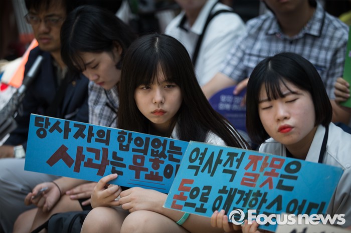 (서울=포커스뉴스) 6일 오후 서울 종로구 주한일본대사관 앞에서 열린 일본군 '위안부' 문제 해결을 위한 제1238차 정기 수요집회에서 학생들이 한일 합의를 반대하는 피켓을 들고 앉아 있다.