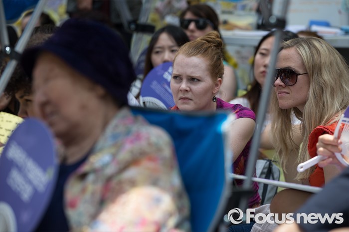 (서울=포커스뉴스) 6일 오후 서울 종로구 주한일본대사관 앞에서 열린 일본군 '위안부' 문제 해결을 위한 제1238차 정기 수요집회 에서 외국인 참석자들이 침울한 표정을 지으며 자리를 지키고 있다.