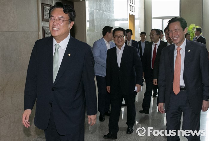 (서울=포커스뉴스) 6일 오후 서울 여의도 국회에서 운영위원회 전체회의를 마친 정진석(왼쪽) 새누리당 원내대표와 우상호(오른쪽) 더불어민주당 원내대표, 박지원 국민의당 원내대표가 이동하고 있다.