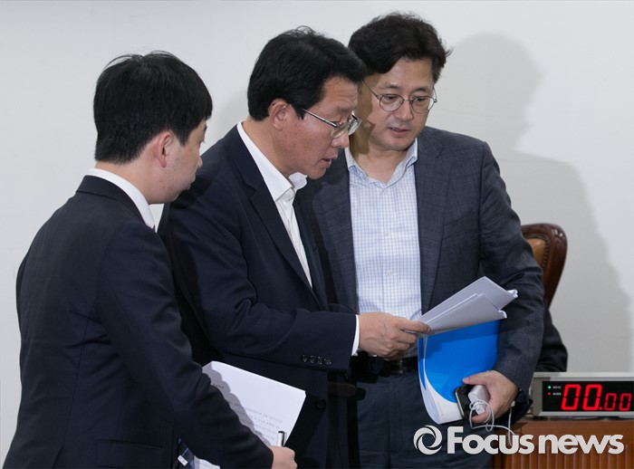 (서울=포커스뉴스) 6일 오후 서울 여의도 국회에서 가습기살균제 사고 진상규명과 피해구제 및 재발방지 대책마련을 위한 국정조사특별위원회 전체회의를 마친 김상훈(가운데) 새누리당 간사와 홍익표(오른쪽) 더불어민주당 간사가 대화하고 있다.