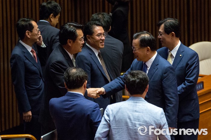 (서울=포커스뉴스) 정진석 새누리당 원내대표와 김부겸 더불어민주당 의원이 6일 오후 서울 여의도 국회에서 열린 '제343회 국회(임시회) 제8차 본회의'에 참석해 악수 하고 있다.