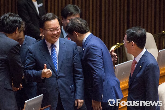 (서울=포커스뉴스) 김도읍(오른쪽) 새누리당 원내수석부대표와 김부겸 더불어민주당 의원이 6일 오후 서울 여의도 국회에서 열린 '제343회 국회(임시회) 제8차 본회의'에 참석해 대화 하고 있다.