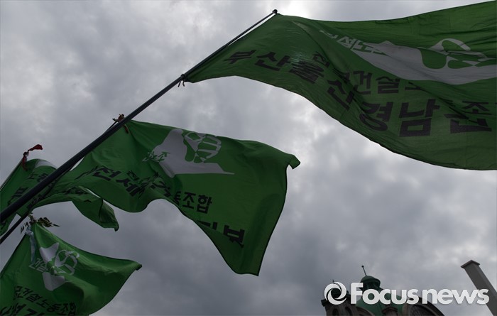 | △ 먹구름 낀 하늘, 펄럭이는 건설노조 깃발 |