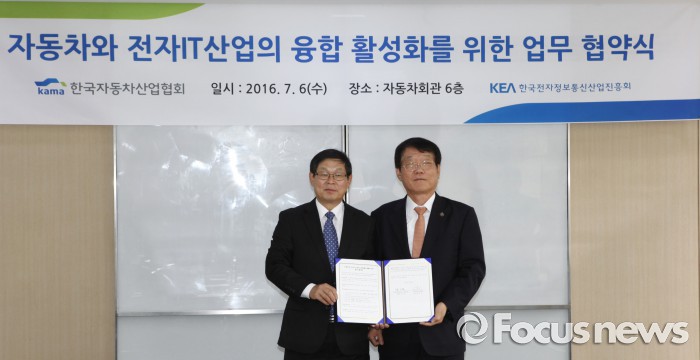 (서울=포커스뉴스) 한국자동차산업협회(KAMA)와 한국전자정보통신산업진흥회(KEA)는 6일 서초동 자동차회관에서 자동차와 전자·IT산업의 전략적인 협력과 융합 활성화를 위해 업무협약을 체결했다.