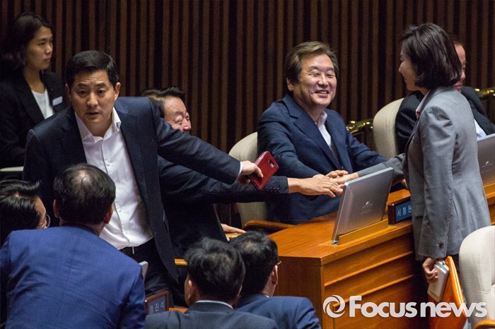 (서울=포커스뉴스) 김무성(오른쪽 두 번째) 새누리당 전 대표와 나경원(오른쪽) 새누리당 의원, 한선교(오른쪽 세 번째) 새누리당 의원이 6일 오후 서울 여의도 국회에서 열린 '제343회 국회(임시회) 제8차 본회의'에 참석해 손을 맞잡고 있다.
