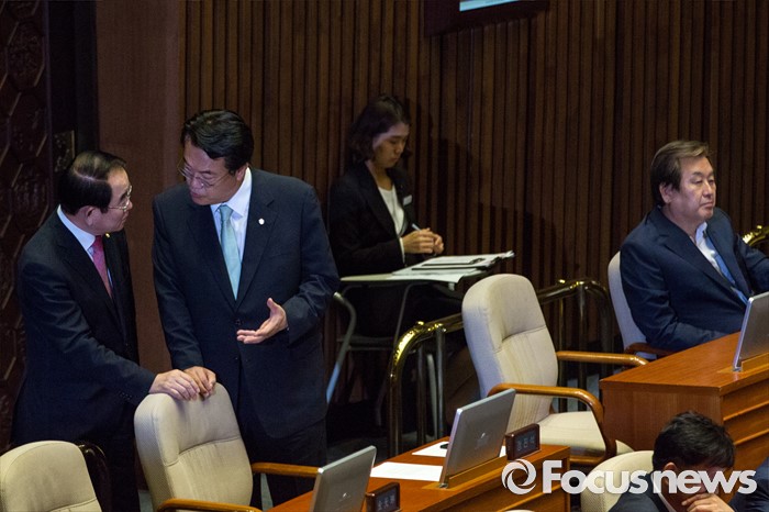 (서울=포커스뉴스) 정진석(왼쪽 두 번째) 새누리당 원내대표와 박명재(왼쪽) 새누리당 사무총장이 6일 오후 서울 여의도 국회에서 열린 '제343회 국회(임시회) 제8차 본회의'에 참석해 대화 하고 있다.