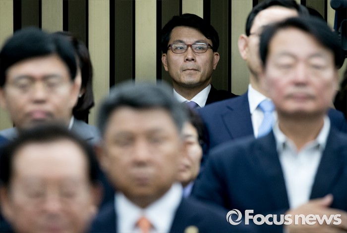 (서울=포커스뉴스) 6일 오후 서울 여의도 국회에서 열린 새누리당 의원총회에 참석한 윤상현 의원이 국기에 대한 경례를 하고 있다.