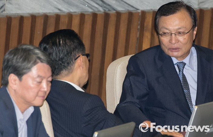 (서울=포커스뉴스) 6일 오후 서울 여의도 국회에서 열린 343회 국회(임시회) 8차 본회의에 참석한 이해찬(오른쪽) 무소속 의원과 박지원(가운데) 국민의당 원내대표가 대화하고 있다. 왼쪽은 안철수 국민의당 전 대표.