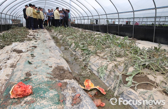 (부여=포커스뉴스) 이동필 농림축산식품부 장관이 6일 오후 집중호우로 수해를 입은 충남 부여 정동리 수박 비닐하우스를 찾아 수해를 입은 농작물을 살펴본 뒤 농민들의 애로사항을 듣고 있다.