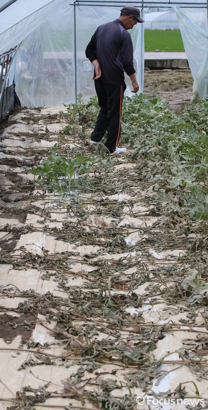 (부여=포커스뉴스) 6일 오후 집중호우로 수해를 입은 충남 부여 정동리 수박 비닐하우스에서 농민이 피해를 입은 농작물 사이로 걷고 있다. 이날 이동필 농림축산식품부 장관은 농작물 수해지역과 농민의 애로사항을 점검했다.