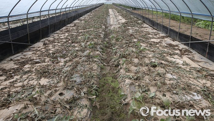 (부여=포커스뉴스) 6일 오후 집중호우로 수해를 입은 충남 부여 정동리 수박 비닐하우스에서 농작물이 말라죽어 있다. 이날 이동필 농림축산식품부 장관은 농작물 수해지역과 농민의 애로사항을 점검했다.