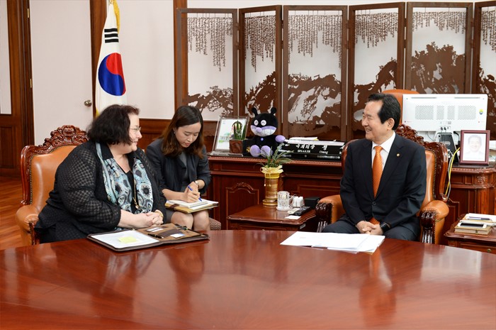 (서울=포커스뉴스) 정세균 국회의장이 6일 오전 서울 여의도 국회 의장집무실에서 클레어 펀리(Clare Fearnley) 주한뉴질랜드대사와 면담을 하고 있다. <사진제공=국회>